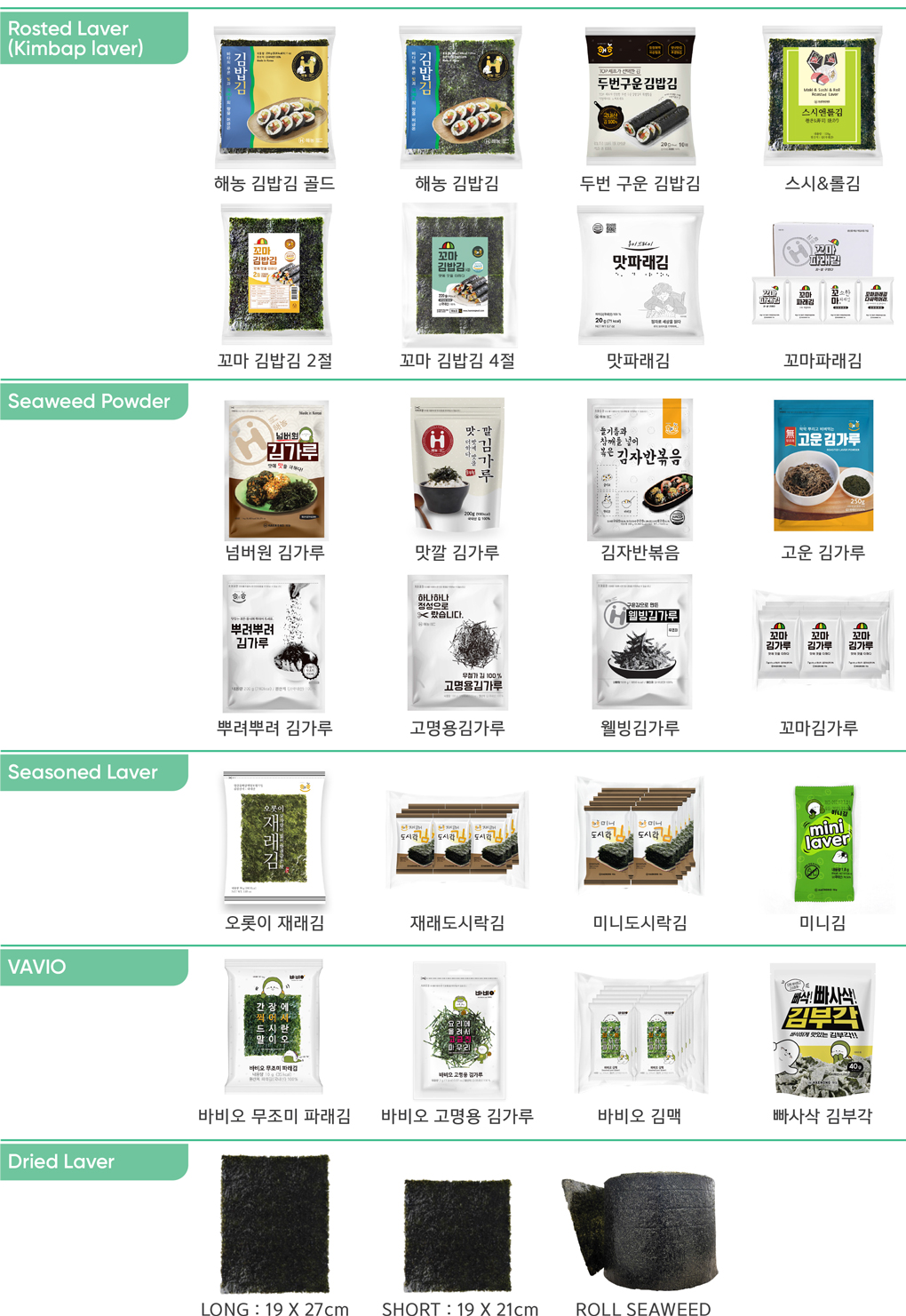 We have Roasted Laver (Kimbap Laver) , Seaweed Powder, Seasoned laver, VAVIO, and Dried laver
